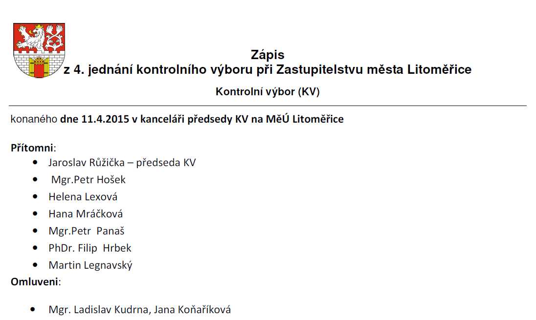 posledni zapis kontrolniho vyboru z 15.3.2017 hlavne ze mame placenyho predsedu. Sorry jako ale ty prachy by slo fakt vyuzit pro mesto smyslupnejs https://www.litomerice.cz/zapisy-vyboru