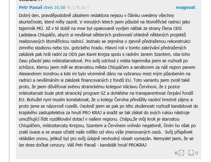 Ještě než byla diskuze pod zmíněným článkem z litoměřického deníku stažena stačil jsem zaznamenat příspěvek tuším pana Hrkala ze strany zelených, že příspěvek pana Panaše je falešný, neboli, že ho nepsal sám pan Panaš, ale pouze někdo jeho jménem. Teď jde o to zda tento příspěvek psal skutečný pan Hrkal. :P Ale jestliže došlo ke stažení celé diskuze pod článkem, předpokládám, že to opravdu nepsal pan Panaš.