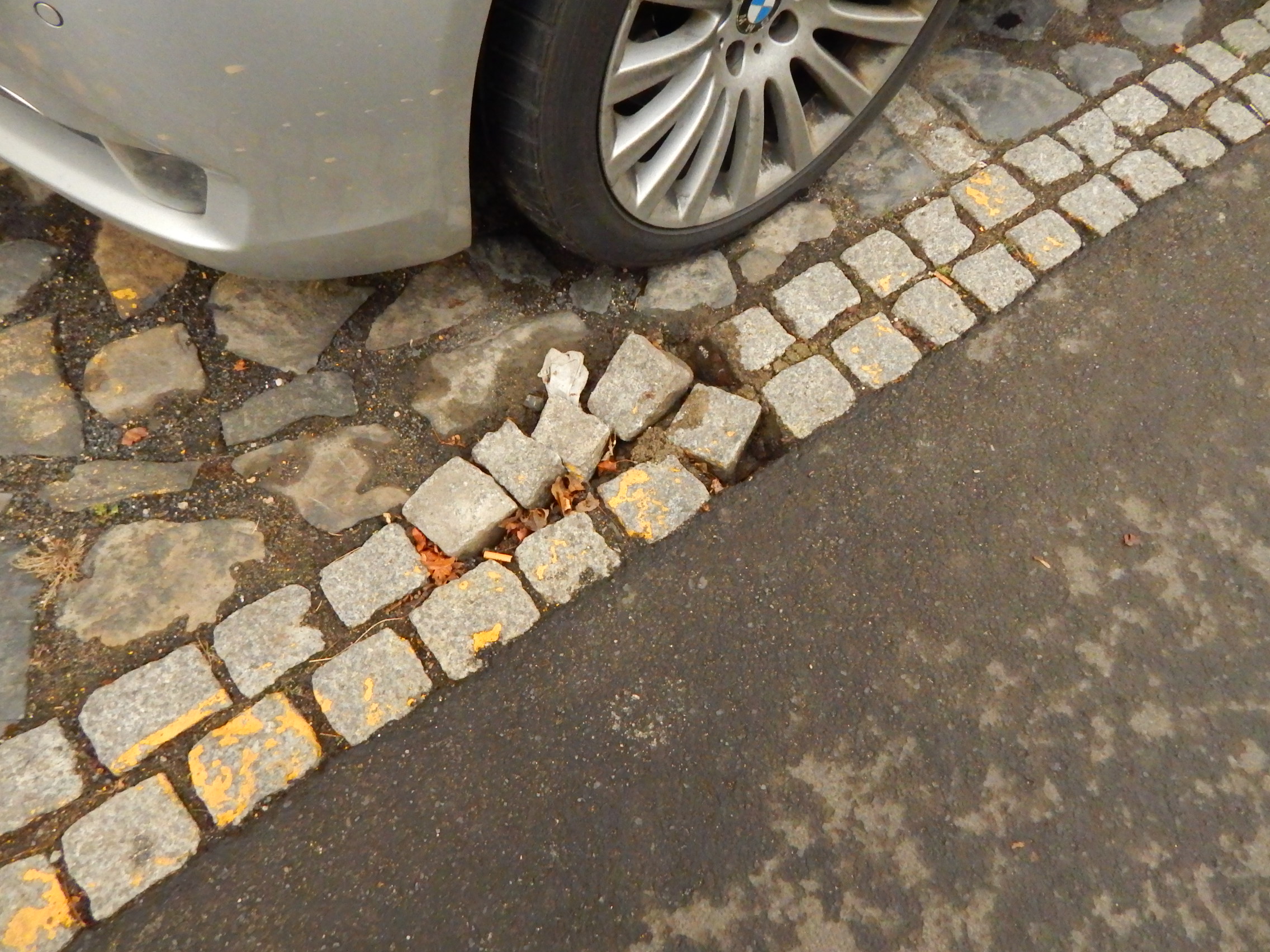 Ty ohraničující drobné žulové kostky se na jedné straně moc " nesnoubí " s asfaltobetonem, natož pak na straně druhé s tou dlažební "divočinou" !