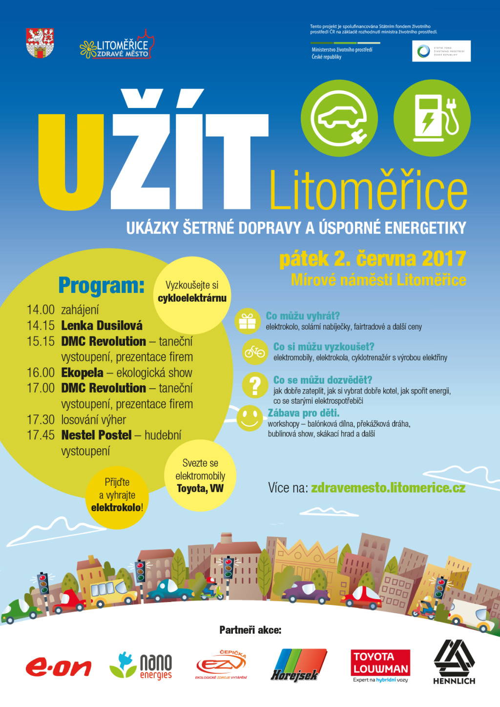 Pokud si chcete vyzkoušet exkluzivní elektromobil značky Tesla, elektromobily značek VW a hybridní vozy Toyota, vidět chytré parkování, vyhrát elektrokolo a další zajímavé ceny, vyzkoušet si cykloelektrárnu a na vlastní pohon si dobít mobil či vyšlapat čerstvý džus, tak nesmíte chybět v pátek 2. června od 14 hod. v Litoměřicích na náměstí, kde se již potřetí uskuteční akce nazvaná U-ŽÍT Litoměřice.