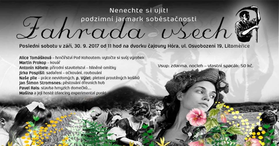 Pro koho je Zahrada Čech příliš velká a komerční záležitost, je zván na Zahradu všech - podzimní jarmark soběstačnosti. Uskuteční se v sobotu 30. září od 11.00 do 22.00 na dvorku před čajovnou Hóra, ul. Osvobození. Už potřetí jste srdečně zváni do přátelské atmosféry společně tvořeného jarmarku, kde můžete směňovat, navzájem se učit, sdílet, poznávat i prodávat. Můžete se těšit na směňování a prodej sazenic (stromků, zeleniny, bylin…), osiva, výpěstků, domácích výrobků (pivo, sýry, kváskový chléb, zavařeniny, přírodní medicíny…) i řemeslných výrobků (keramiky, proutěné košíky…) Během celého jarmarku Vám budou k dispozici prodejní a konzultační stánky s praktickými ukázkami.