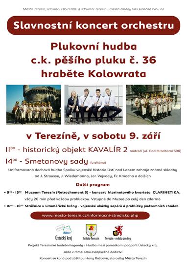 Dále na koncert orchestru Plukovní hudba c.k. pěšího pluku č. 36 hraběte Kolowrata v sobotu 9.9. 2017 v Kavalíru 2 a ve Smetanových sadech.