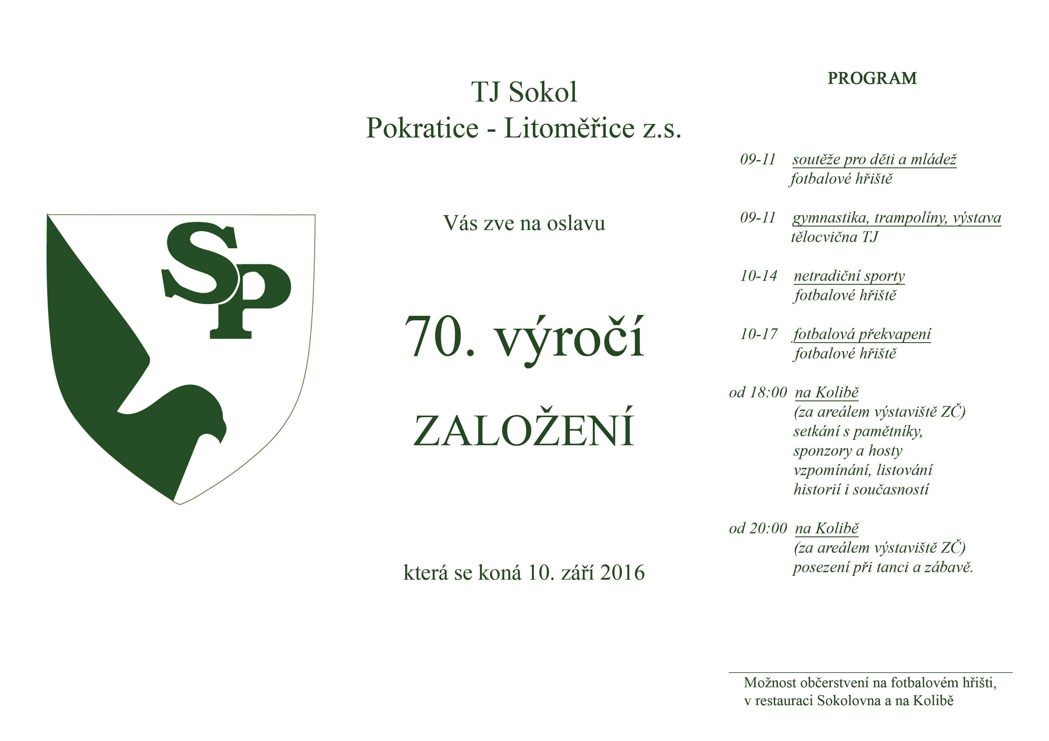 V sobotu 10. září 2016 si pokratičtí sportovci připomenou vznik místní tělovýchovné jednoty. Již 70 roků zde fungujeme a po celý den se budeme bavit pohybem i dalšími sportovními aktivitami pro všechny generace . Akce vyvrcholí slavnostním večerem na Kolibě, setkáním pamětníků, současných i bývalých členů, sponzorů a příznivců pohybu, samozřejmě při tanci a dobré zábavě.