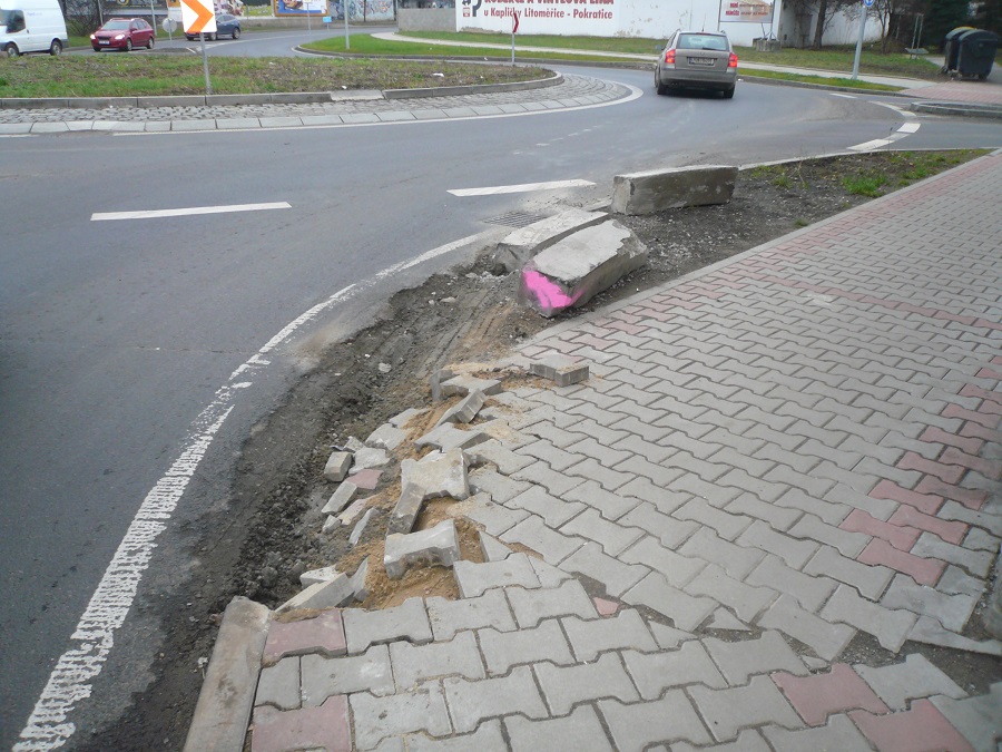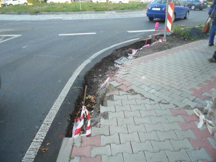 A opět se provádí oprava poškozené části chodníku a obrubníků. Je to sice chvályhodné, ale zajímavým způsobem a možná i nebezpečným bylo provedeno označení tohoto výkopu. Na okraj výkopu, těsně u vozovky byly zaraženy železné pruty na které byly nasazeny obarvené PET láhve. Dlouho toto označení nevydrželo. Je s podivem, že nedošlo k proražení pneumatik při přejíždění tohoto označení. Podle vyjádření pracovníků, kteří tam zrovna začali opravovat, bude oprava jako předchozí provedení. A tak nevím, jestli to má vůbec cenu.