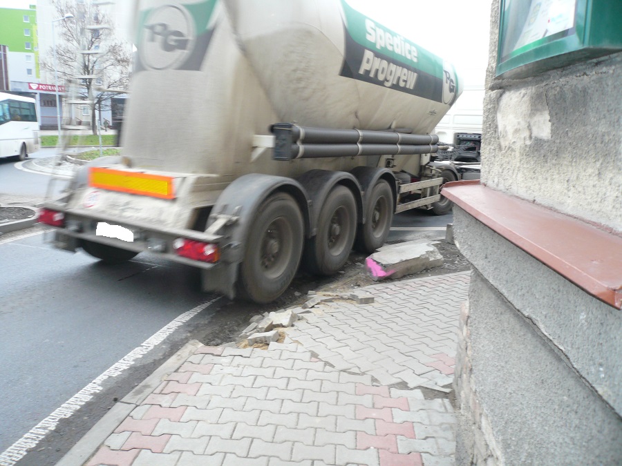 Stav dnes ráno je znatelně horší než včera. Obrubník byl na rozdíl od toho předešlého, který byl vymrštěn na chodník, vytažen až do vozovky. Zámková dlažba je již úplně uvolněna.