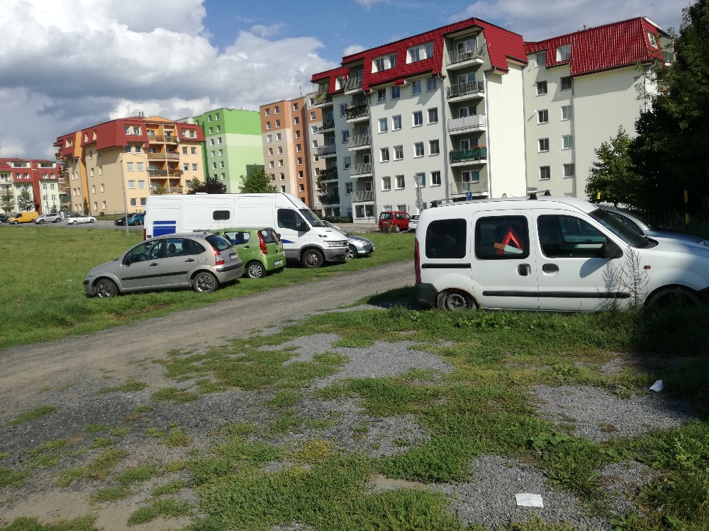 Ráno, před 8. hodinou, jsou všechna parkovací místa před "centrálkou" obsazená. A až na malé výjimky, i pokračování k bazénu a na druhou stranu ke gymplu. Je otázkou času, kdy tráva zmizí úplně. Nedivím se zoufalství dojíždějících strávníků, majících na oběd půlhodinu.