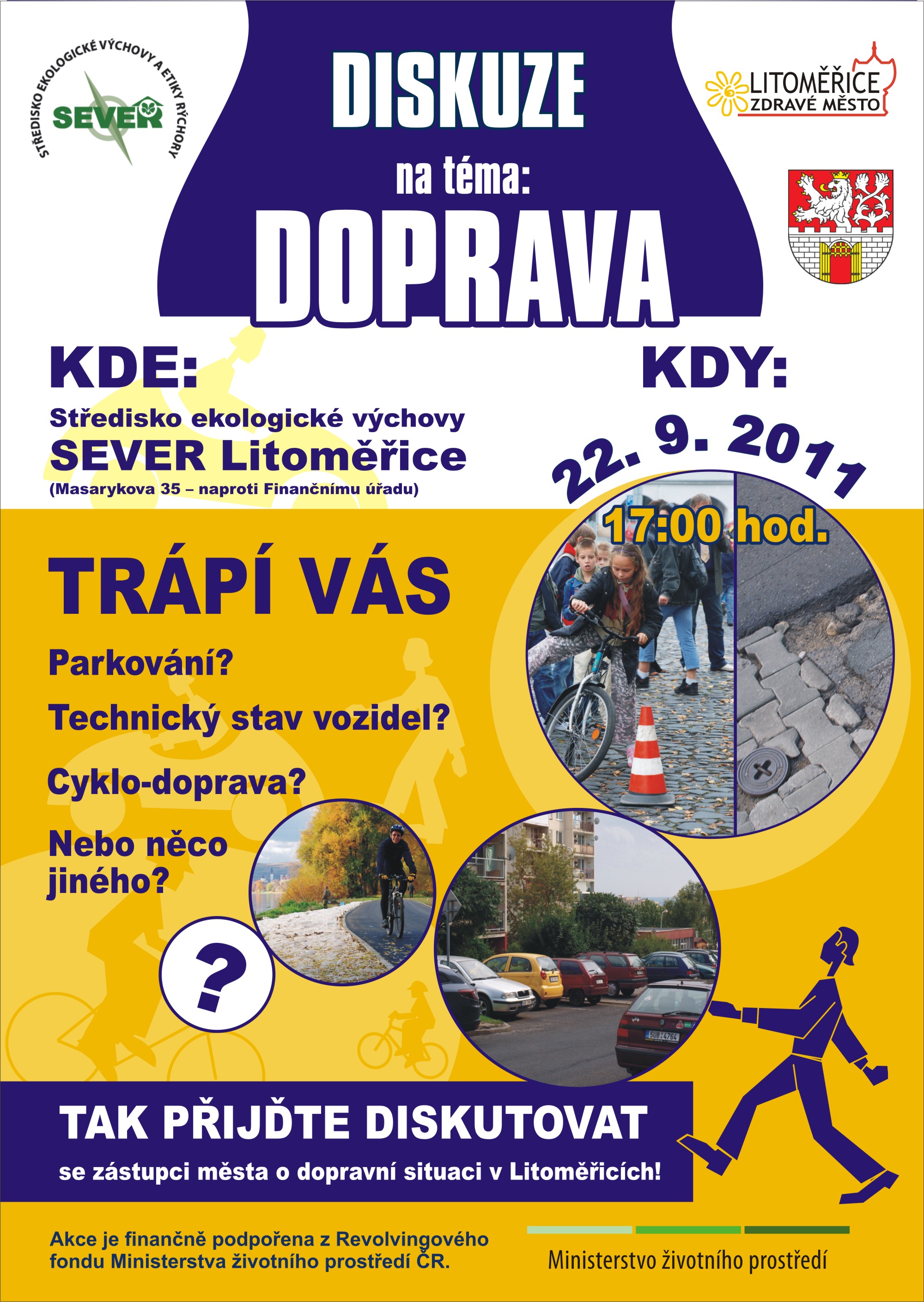 22.9. se od 17 hod. uskuteční ve Středisku ekologické výchovy SEVER (Masarykova 35, Litoměřice - malá budova ZŠ naproti FÚ) kulatý stůl na téma doprava v Litoměřicích. Účast už přislíbili někteří politici, úřednici a zástupci policie. Pokud máte dojem, že toto fórum nečtou ti odpovědní, máte možnost některé problémy nebo návrhy sdělit osobně.