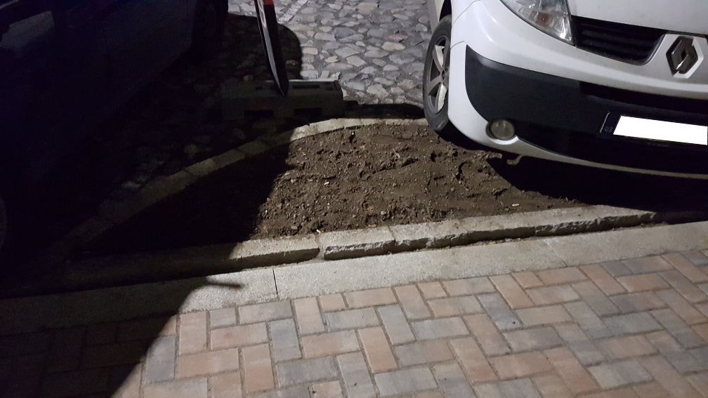 Stejně pěkně vypadá zcela nová zeleň u Lidlu naproti autoservisu. Servisovaná auta, která stála na trávě ji dala pěkně zabrat.