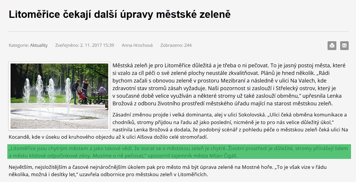 V aktualitách MÚ ze dne 2.11.2017 /A.Hrochová/ s titulkem - Litoměřice čekají další úpravy městské zeleně - najdeme i tento odstaveček ! Cituji: