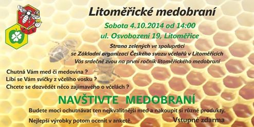 Zveme Vás na historicky první Medobraní v Litoměřicích. Nebojte, nečeká Vás žádná politická propagace. Naopak budete mít šanci ochutnat to nejlepší od místních včelařů. Nejenom med, ale i výrobky s medem související. Hodnotit budete moci v anketě a můžete medové produkty nejem ochutnat, ale i zakoupit. Medobraní se uskuteční v Okamžiku (sál vedle čajovný Hóra), ul. Osvobození 19, dne 4.10.2014 od 14 hodin.