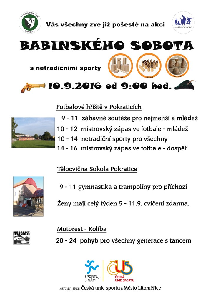 Tradičně, již pošesté, s podporou města a v rámci akce podporované Českou unií sportu Sportuj s námi, Vás zveme do Pokratic na Babinskou sobotu.