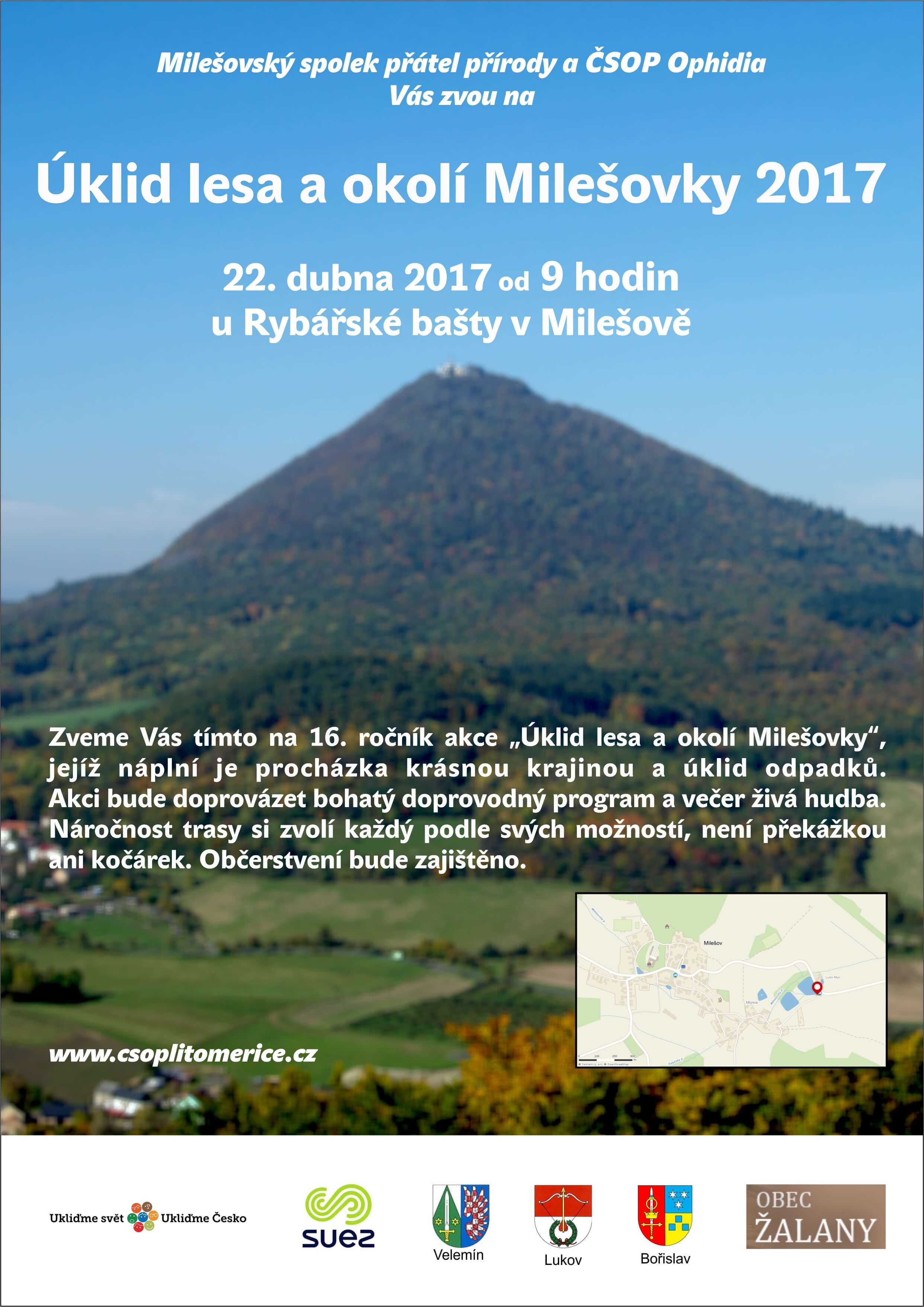Zveme Vás na 16. ročník akce „Úklid lesa a okolí Milešovky“, jejíž náplní je procházka krásnou krajinou a úklid odpadků. Akci bude doprovázet bohatý doprovodný program a večer živá hudba. Náročnost trasy si zvolí každý podle svých možností, není překážkou ani kočárek. Občerstvení bude zajištěno. Akce proběhne 22. dubna od 9 hodin, sraz u Rybářské bašty v Milešově. Více zde http://csoplitomerice.cz/uklid-lesa-oko ... ovky-2017/