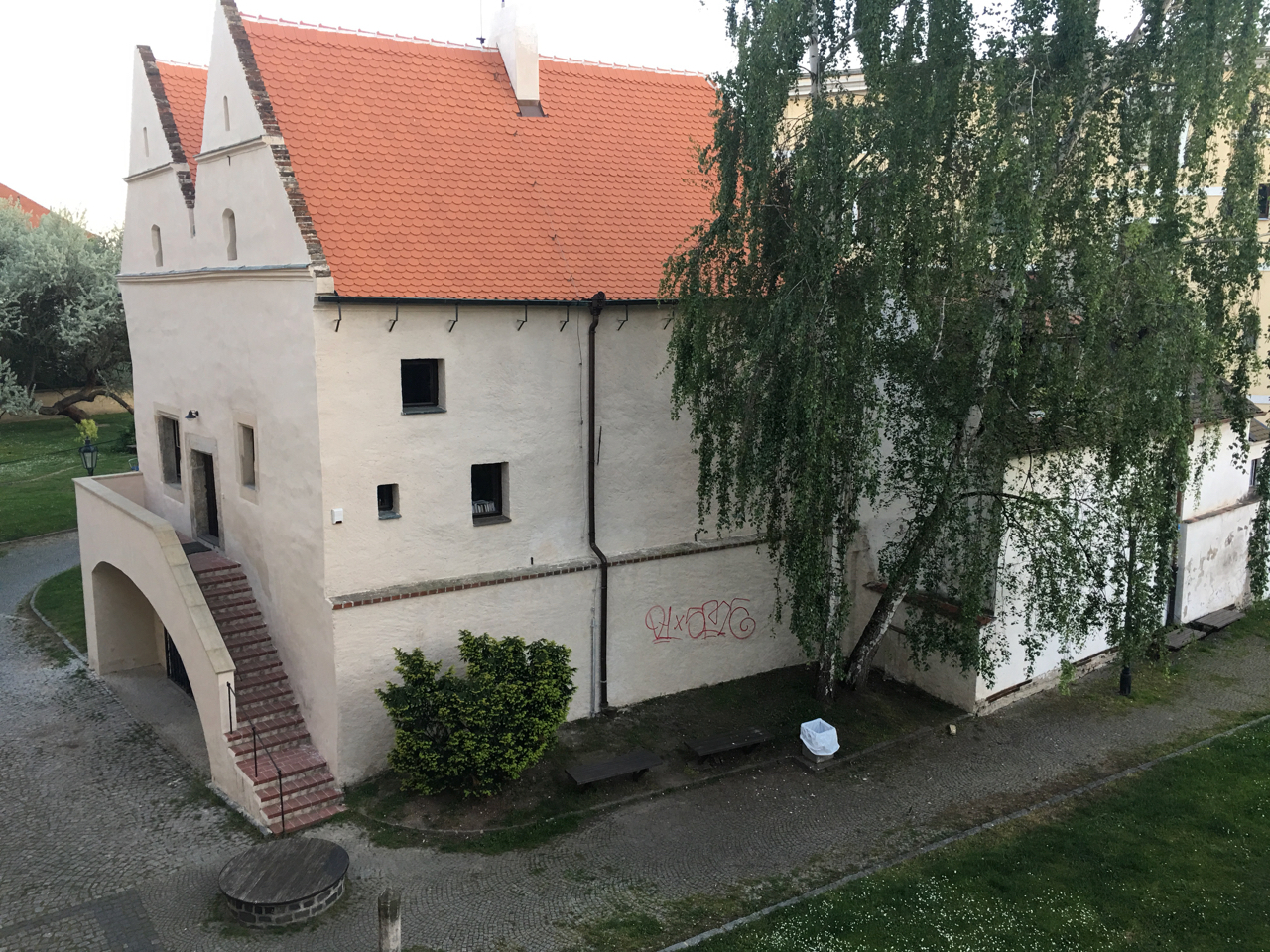 Nově opravené gotické dvojče. Fasáda to dlouho nevydržela. Ano, kdysi se parkány zamykaly večer, teď si úřad zamyká jen tu část u sebe a na zbytek se kašle, MP se tu neukáže a takhle to dopadá :(
