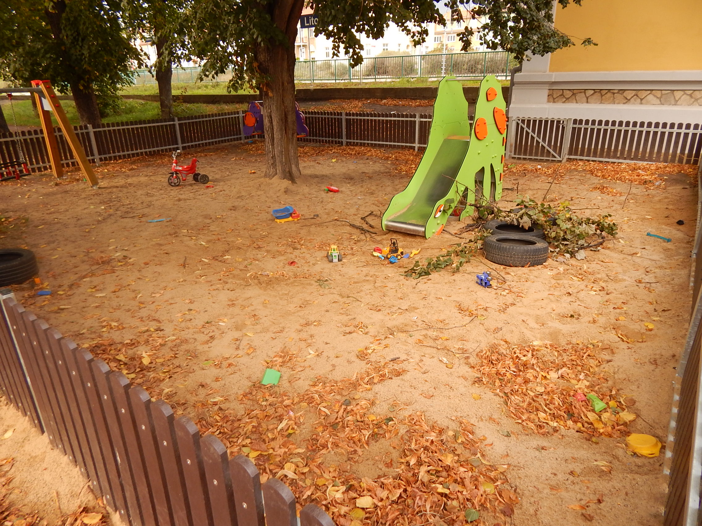 Už po odkvětu blízkých lip, jejich okvětí, dále naváté papíry,napadané větvičky. Nyní navíc spadané listí, staré pneumatiky coby herní prvky. Přilehlý neudržovaný parčík s plechovkami,vajgly,PET lahvemi je ozdobou přednádražního prostoru.