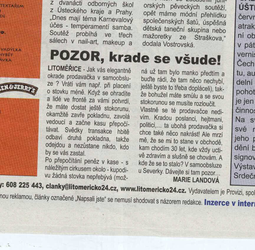 10. ještě k článku - na webu byl označen Napsali jste. V novinách bohužel ne. Chyba. Ovšem paní Landová dopisovala hlavně v kauze Bulasová a nebyl důvod jí nevěřit. Kontakt na ní jsme předali vedení firmy provozující samoobsluhu, v dalším vydání novin vyjde článek chválící tuto prodejnu. Co člověk, to názor :).
