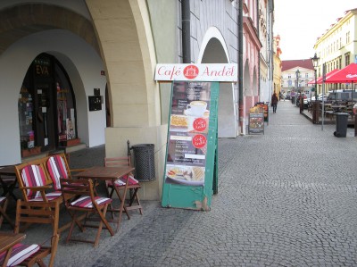 Další z mnoha příkladů? - Café ANDĚL - Jeho reklamní stojan je " lidovou tvořivostí " stiženou velikášstvím. Mimochodem se tato jeho expanze promítá i do doslovné okupace veřejného prostoru v podloubí /stolky,křesílka/, které snad i místem