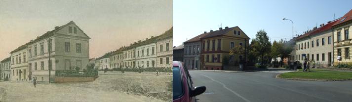 Přináším jednu ze změn na náměstí a to prostor nynější lékárny. Všimněte si malé benzinové pumpy u chodníku.