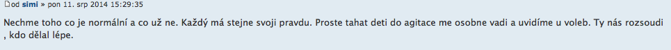 pro Rajnohu, snad ani nebudu psát, že je to vytržené z jiného dílu fóra a byla to moje reakce na podpisovou akci. Nevím jestli jste na akci byl, v parku, ale já celou dobu a neslyšel jsem jak od moderátorů, tak z nás ODS nikoho agitovat děti. Bylo jich na akci spousty, dobře se bavili, někteří rodiče je oblékli podle svého přesvědčení do stranických dresů a i tyto děti nikdo nevyháněl ani nepřevlékal, neagitoval.