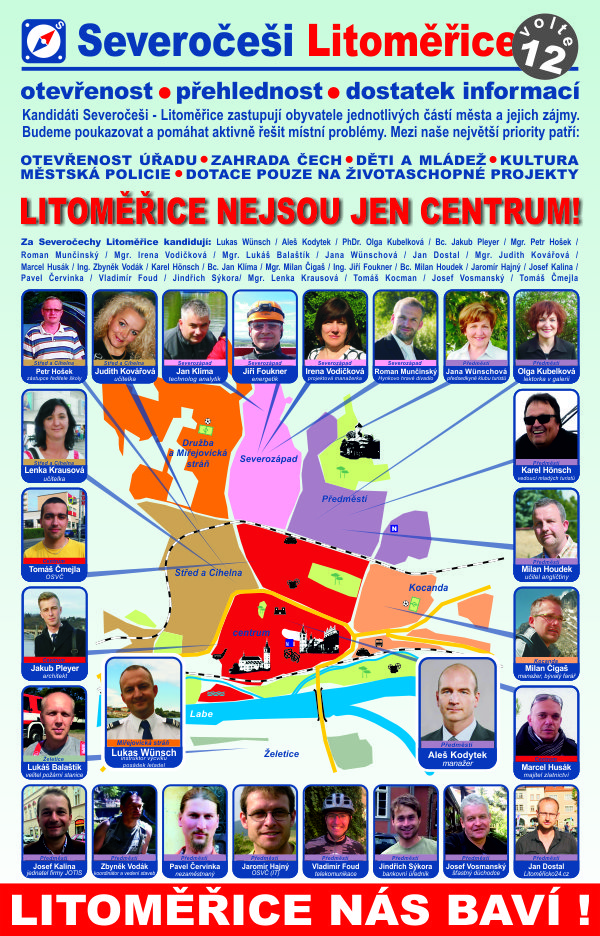 Tak jsem se vrátila z dovolené zpátky do Litoměřic a hle hle co mé staré oči nevidí. Politické strany již vyvěšují volební plakáty a transparenty. ODS se chlubí tím, že zařídili i to, že ráno vyjde slunce a místo modrého ptáka mají teď ve znaku nějakého modrého dinosaura. Ale dech mi vyrazil volební plakát podivného hnutí Severočeši. Sem se totiž aktuálně přemístil socanský pisálek Dostál. Před pár týdny ještě rozkrádal městské finance coby pravá ruka místního socanského dobroděje jménem Szanto. Ten je ale jaksi mimo hru a tak se rodina Dostálů snaží najít další cestičku jak pouštět městu žilou. Jak to ale udělat když Dostála znají od Lovosic po Štětí a nikdo s ním už nechce mít nic společného ? Jednoduše ! Podvedeme voliče ! Na volebních plakátech Severočechů jsou tváře všech kandidátů ale tvář pana Dostála někam zapadla. Jeden by si mohl myslet, že se za něho Severočeši stydí. Bohužel je to jinak. Je to podvod na voliče. Na kandidátní listině pan Dostál vesele svítí na šestém místě. Hádám, že se tu za chvíli objeví článek od litomericko24 kdy bude vysvětleno, že pan Dostál v okamžiku focení kandidátů právě zachraňoval Afriku před ebolou. A jako novinář nemá pochopitelně jedinou použitelnou fotografii.