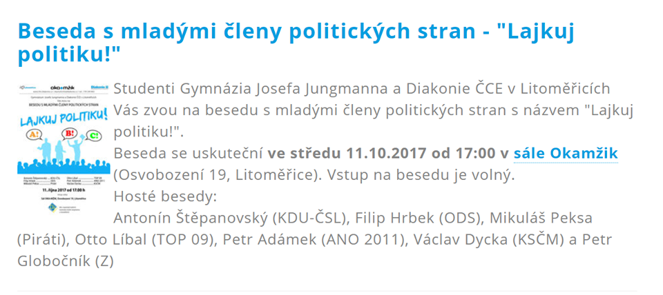 Jaroslav Tvrdik píše:Hnutí ANO je v litoměřickém zastupitelstvu v opozici a nemá v současné době ani žádného zástupce v radě města. Odbor územního rozvoje spadá do gesce místostarosty Václava Červína. Je však třeba podotknout, že stavební odbor spadá do přenesené kompetence výkonu státní správy nikoli pod přímé řízení samosprávy. Na posledním jednání zastupitelů situaci okolo "žluté haly" vsvětloval vedoucí stavebního odboru ing. Nejtek. Vše je vždy možné shlédnout na záznamu z jednání na You Tube kanálu na stránkách města: http://www.litomerice.cz