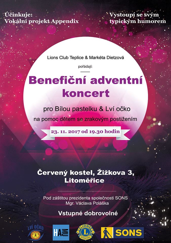 Benefiční adventní koncert v Červeném kostele v Litoměřicích (Žižkova 3). Čtvrtek 23.11. v 19:30–22:00. Také letos chce podpořit dobrou věc! Koncert proběhne ve spolupráci s Vokálním projektem APPENDIX. Dále vystoupí studenti ZUŠ Litoměřice, Konzervatoře v Teplicích.Těšit se můžete na pestrý program laděný nejen do předvánoční nálady. Uslyšíte i skladby klasické například v podání tria z teplické konzervatoře.