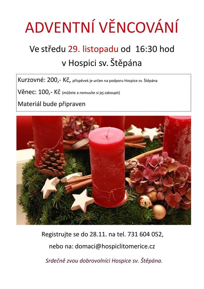 Hospic sv. Štěpána zve na tradiční adventní věncování - přijďte si vyrobit adventní věnec a podpořit tak hospic - http://www.hospiclitomerice.cz/clanky/Adventni-vencovani-2.html. Přihlašování se uzavírá dnes 28. listopadu.