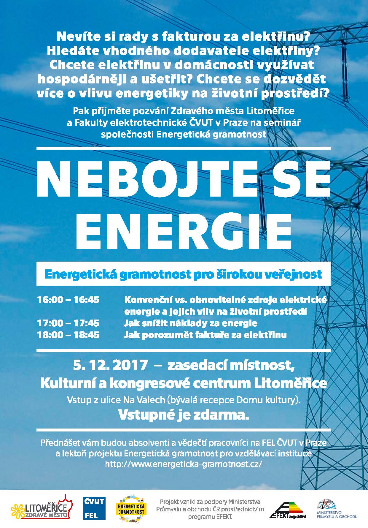 Nebojte se energie a přijďte se poradit. Nevíte si rady s fakturou za elektřinu, hledáte vhodného dodavatele elektřiny, chcete elektřinu v domácnosti využívat hospodárněji a ušetřit, chcete se dozvědět více o vlivu energetiky na životní prostředí? Jak úsporně a efektivně využívat elektrickou energii, poradí seminář Nebojte se energie. „Cílem je prostřednictvím praktických, srozumitelných a interaktivních seminářů poskytnout široké veřejnosti možnost lépe se orientovat v energetice, porozumět za co a kolik peněz vlastně platíme a poradit, na co si dát pozor a jak se chránit proti nekalým praktikám,“ vysvětlil energetický manažer Litoměřic Michal Černý.
