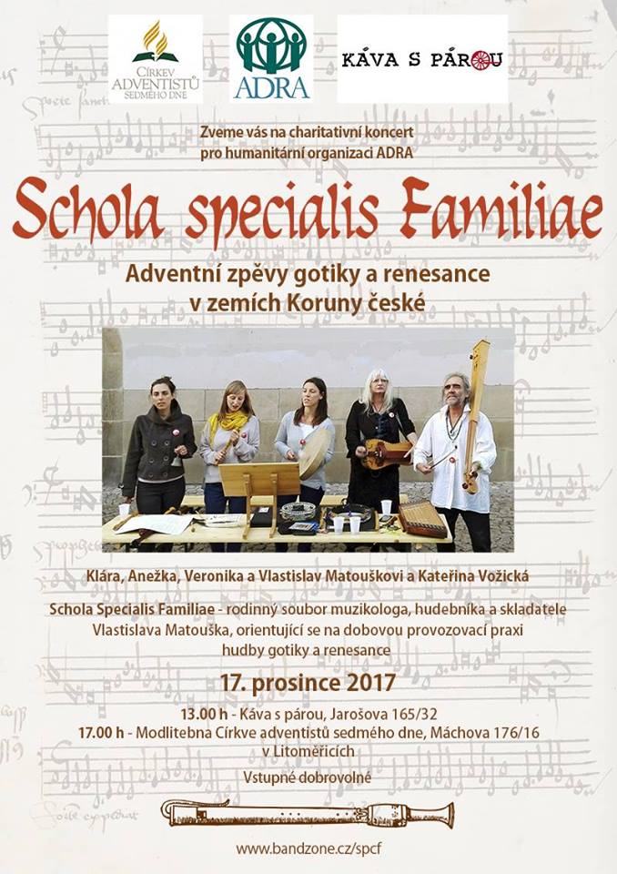Charitativní koncert pro společnost Adra v podání souboru autentické středověké hudby Schola specialis Familiae pod vedením Vlasty Matouška, od 17 hodin bude koncert pokračovat v litoměřické modlitebně sboru Církve adventistů sedmého dne.