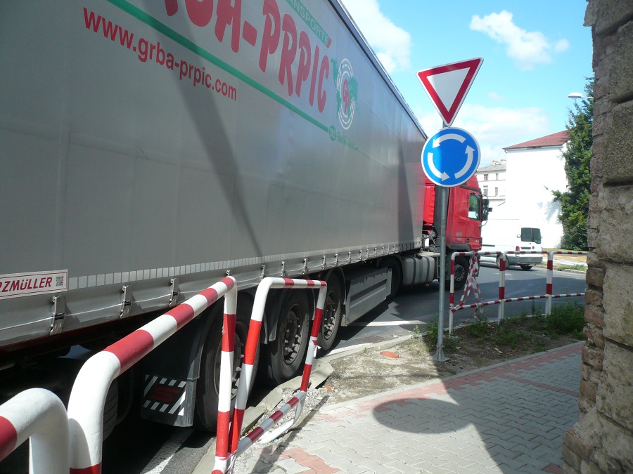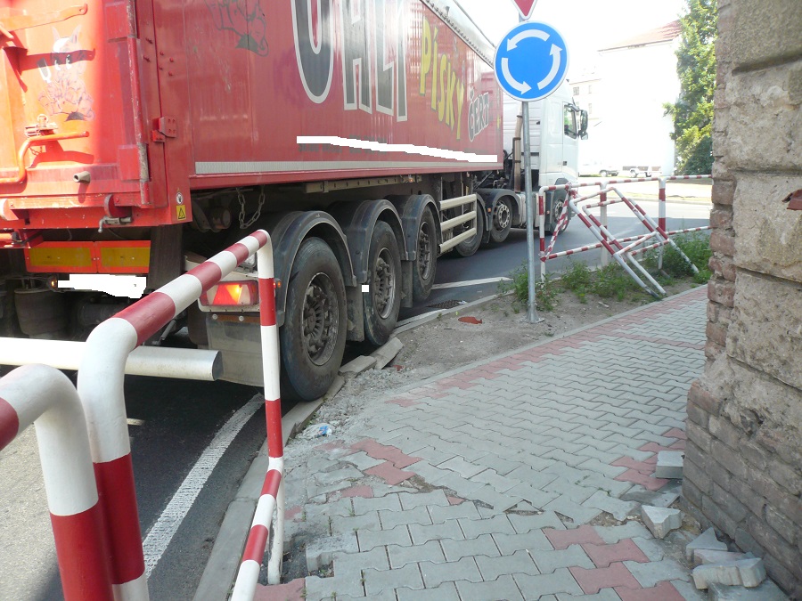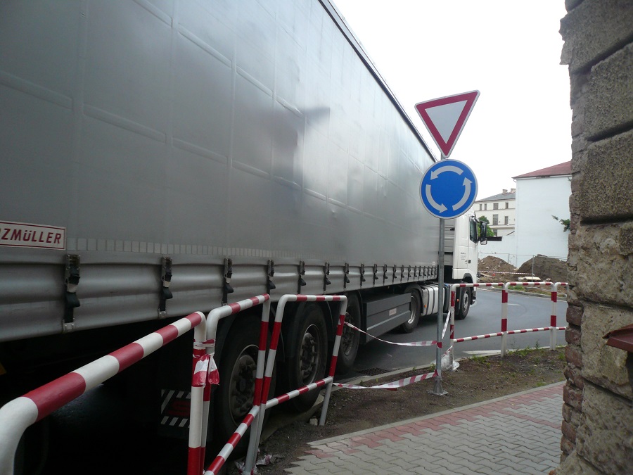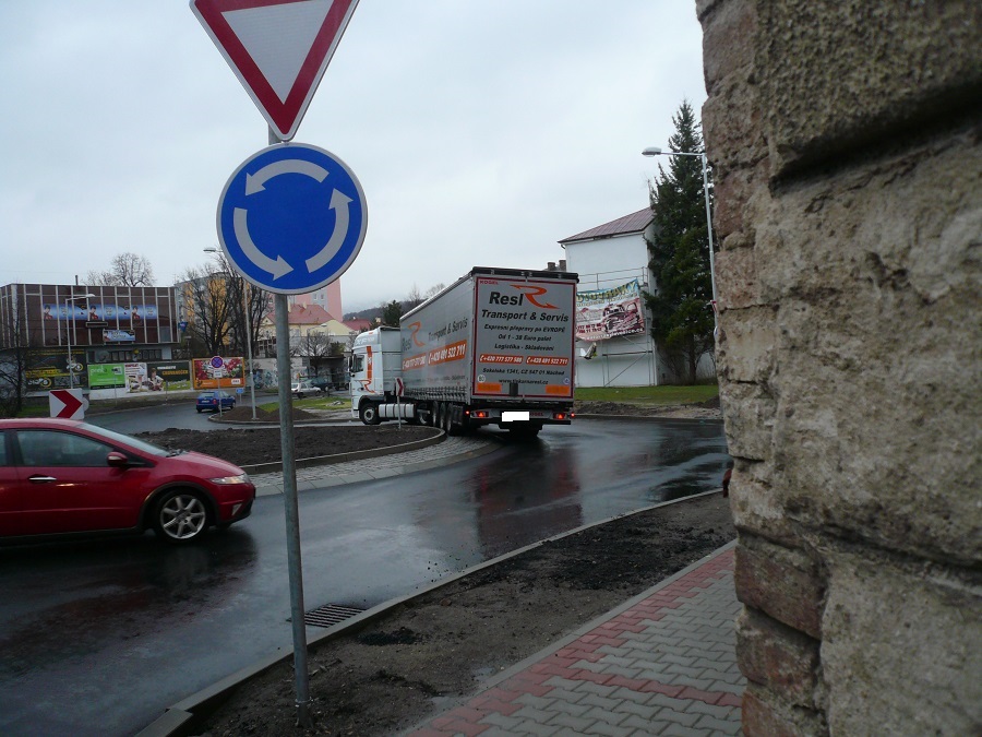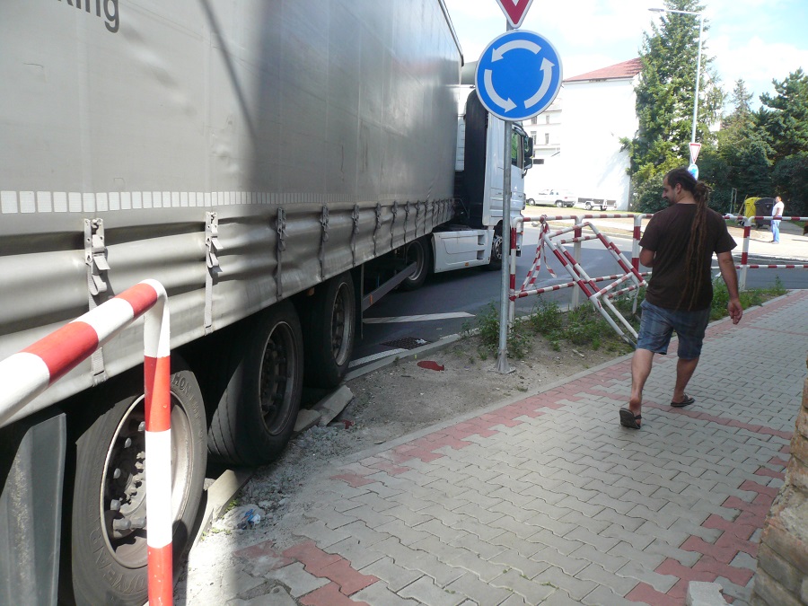 Kruhový objezd je takový jaký je. Při cestováni po ČR jsem nabyl názoru, že je to stále více o lidech-řidičích. Jsou kruháky mnohem menší než tento a projíždějí je kamiony bez větších potíží. Proč dokáže padesát řidičů projet celkem bez problémů a pak se přižene jeden, který jede přes mrtvoly. Zřejmě se v tu chvíli nevěnuje jízdě jak by měl, telefonuje, je ospalý, nebo co já vím co ještě mu brání věnovat své práci naplno. A to nemluvím pouze o tomto objezdu, ale o objezdech obecně. Proč jsou vyvalené kostky na Kocandě když kruhák je dostatečně veliký? Nemá cenu filozofovat o kvalitě řidičů, to má širší souvislosti. Musíme věřit, že po ukončení opravy mostu se to zlepší a většina kamionů se průjezdu města vyhne.