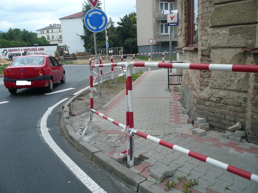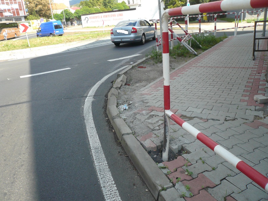 Doposud netknuté zábradlí do ulice Čs.armády je dole. Opět se nějaký řidič vyznamenal. Přesto, že je tam horší nájezd než do Liškovy ulice, omezení týkající se délky vozidel zde není. Protože zábradlí ještě nikdo nezvedl a nenarovnal, je vidět, jak je nebezpečné pro chodce. Pokud se tam chodec bude nacházet, zábradlí ho srazí .