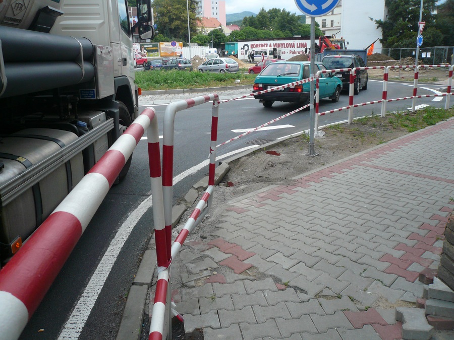 Včera ještě tři pole zábradlí, dnes již jen dvě. Přejetí obrubníků během 30 minut.