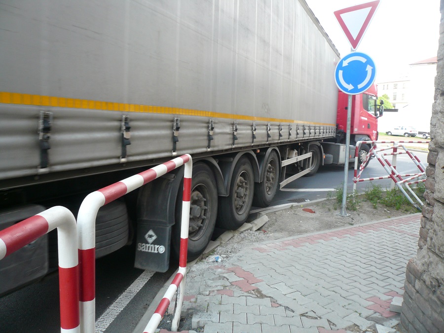 2. Prstenec z dlažby snížit na úroveň vozovky a kousek posunout, ale upravit výjezdový oblouk. Pokud se udělá pouze elipsa, dojde k tomu, že zadní kola návěsů budou přejíždět obrubník na vnitřní straně vozovky.