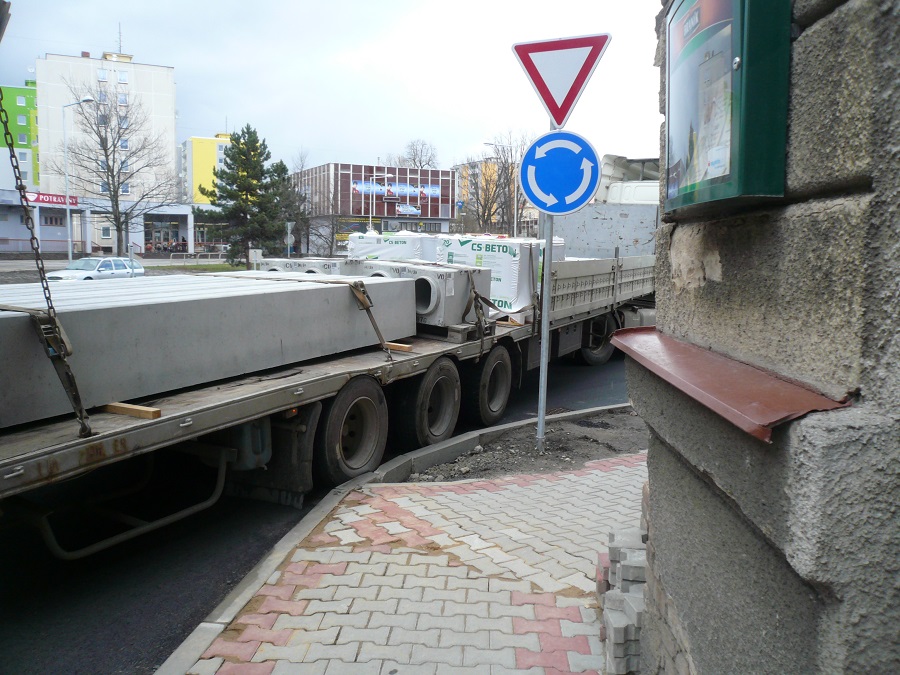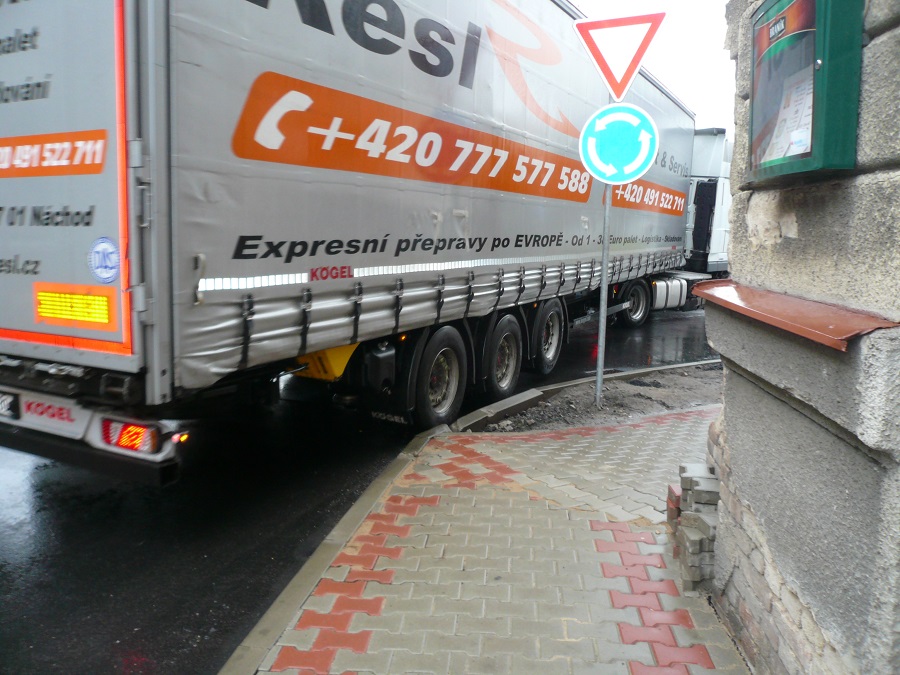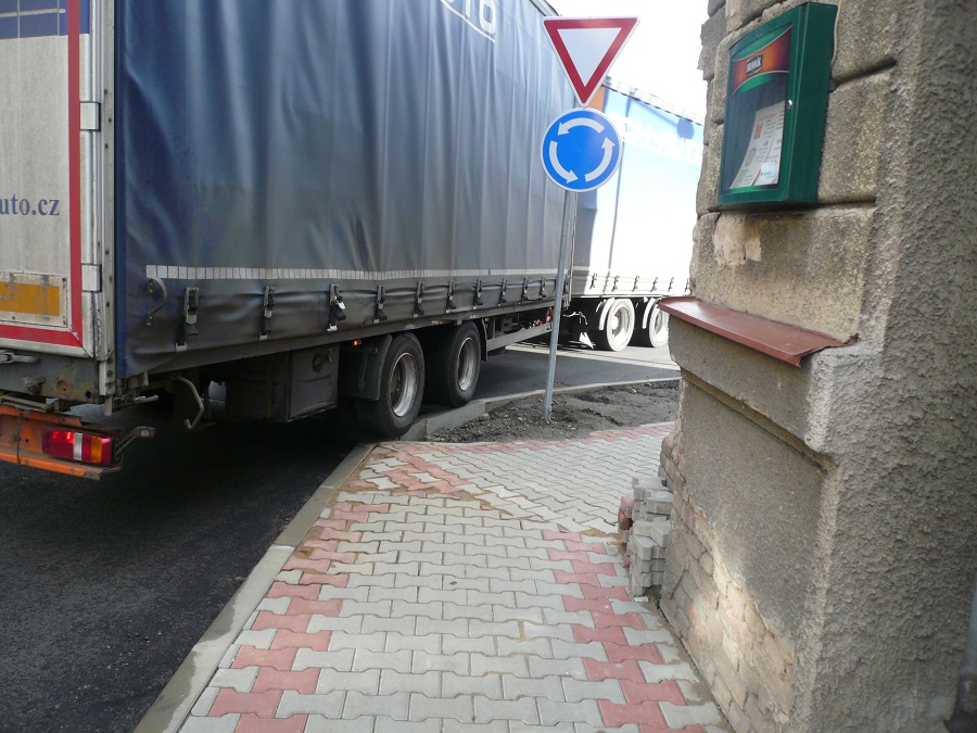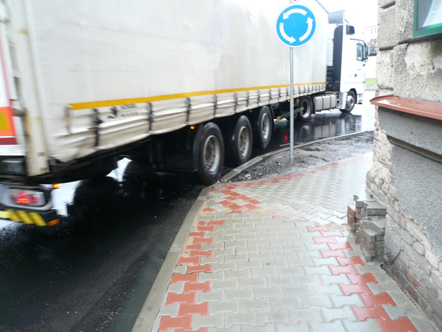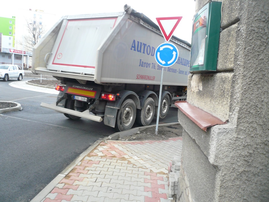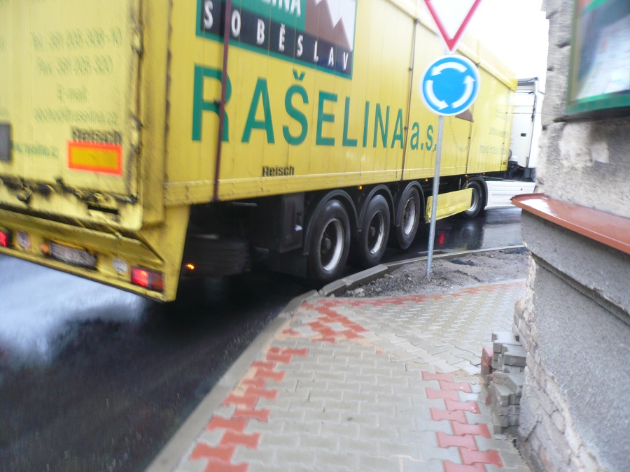 4. Jsem názoru, že při zvýšené opatrnosti, ohleduplnosti a řidičských schopnostech je kruhový objezd průjezdný i pro velké soupravy / ne nadměrné/.Je potřeba vnímat, že se nejedná o kruhový objezd dálničních parametrů, že reflektuje dopravní poměry uvnitř obce a je postaven na silnici určité třídy.