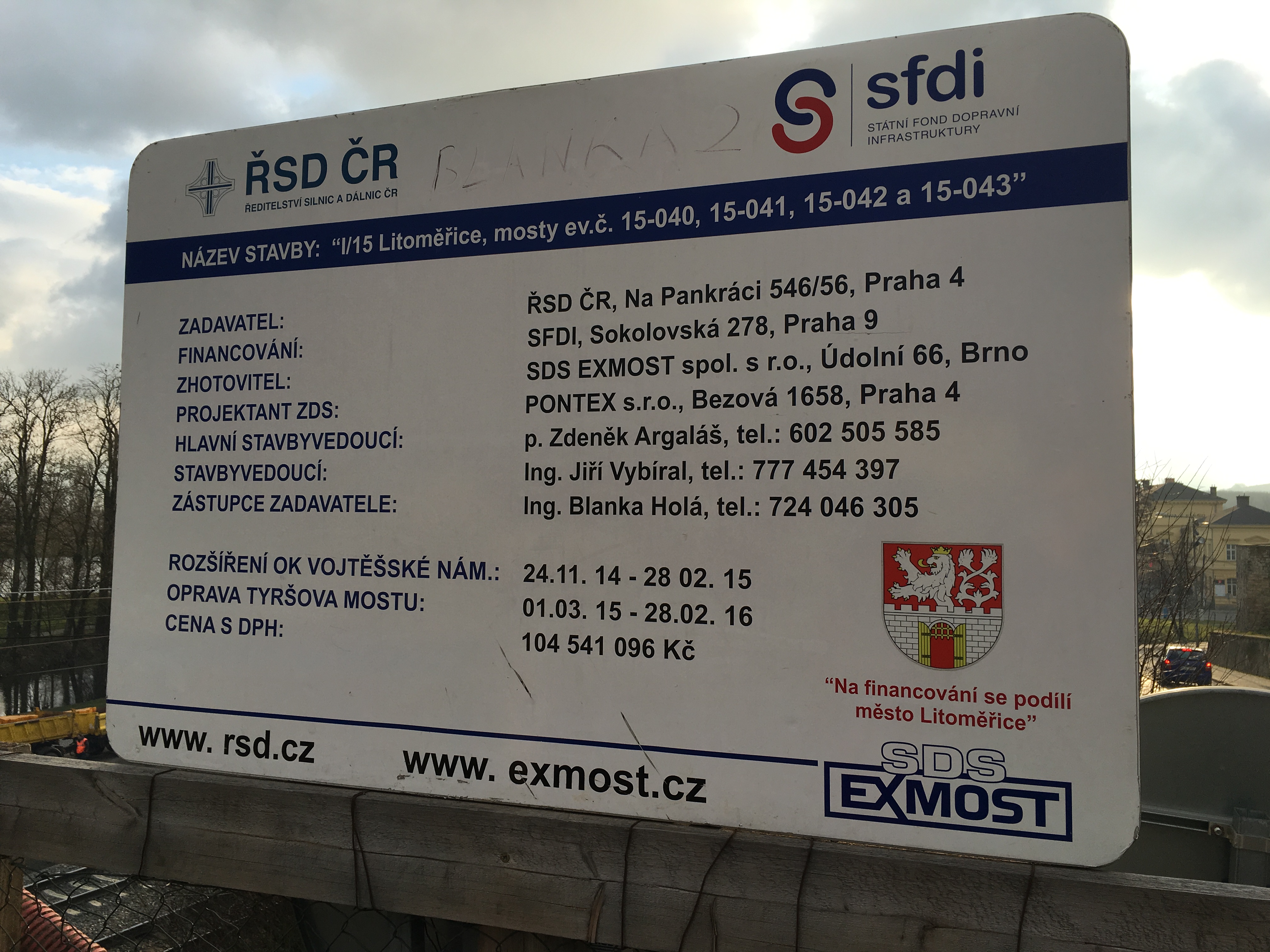 Tady je vyjádření ŘSD k věci: "Zprovoznění silnice na I/15 v Litoměřicích na Tyršově mostě bude až v březnu 2016," uvedla na dotaz redakce mluvčí ŘSD. "Stavba byla od začátku termínově napjatá a tyto nové skutečnosti byly, bohužel, zjištěny na poslední chvíli. Zhotovitel se touto skutečností dostal do skluzu oproti harmonogramu stavby mimo jiné s betonážemi, pokládkou obalovaných směsí a litých asfaltů. Všichni stavitelé vědí, že právě tyto práce jsou vázány na výrobny – betonárny, obalovny, které mají přes zimu odstávky na údržbu a opravy," vysvětlila mluvčí ŘSD. Více v tomto článku: http://www.litomericko.severoceskydenik ... -2016.html