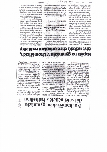 Dnes ráno jsme se jako učitelé litoměřického Gymnázia Josefa Jungmanna setkali se zástupci Ústeckého kraje, zřizovatele školy. A věřte, že to byl otřesný zážitek! Ještě dlouho po skončení schůzky jsem nevěděl, zda před námi nestá......li spíše orientální oligarchové… Místo diskuse, otázek a hledání příčin problému jsme slyšeli jen výtky a hrozby. Co jsme se dověděli? Že kraj stále považuje svou volbu ředitelky za nejlepší možné řešení. Diskusi pan radní Kouda odmítl s tím, že nepřijel s nikým diskutovat. Když jsem mu přece jenom připomněl jeho loňskou větu, kterou pronesl před téměř všemi učiteli školy, že „nebylo vůbec jednoduché instalovat paní Bulasovou do funkce ředitelky“ (čímž de facto stvrdil, že ve jmenování nehrálo roli pořadí doporučené konkurzní komisí, ale prachsprosté partajní zájmy), vztekle jednací místnost opustil. Pan radní pro oblast školství Jakubec nám následně oznámil, že paní ředitelka se na základě dosavadního šetření (komisí vyslanou v pondělí na naši školu týmž úřadem, tedy sociální demokracií ovládaným KÚ) ničím neprovinila. Jinými slovy, kraj už má jasno, ačkoli druhá strana ještě vyslechnuta nebyla! (Zástupci našich odborů jsou pozváni na Krajský úřad až příští čtvrtek…). Mám-li tedy použít už v jiné souvislosti zmínky o 50.letech, rozsudek je předem daný… Šéf školství KÚ pan Harašta nás poté plísnil za to, že jsme si dovolili rozeslat stížnosti a nazval nás škůdci, kteří ničí pověst školy a Ústeckého kraje. Stačí? Pan Jakubec, který si asi jako jediný zástupce supervizorů zachoval alespoň jistou míru schopnosti komunikace, nám neustále kladl na srdce, že naší povinností je především vzdělávat. Nevím, kolik toho pan Jakubec ví o školství, ale chtěl bych mu vzkázat, že naší povinností je také, a možná především, vychovávat! Vychovávat ze studentů občany, kteří si všímají věcí kolem sebe a nejsou k nim neteční. V době, kdy důvěra naší populace v politiky není velká (a po dnešním setkání musel snad každý ztratit i poslední zbytky iluzí…), zůstává škola jednou z posledních institucí, kde by měly být předávány jisté nezpochybnitelné hodnoty a ideály. Tvrdím tedy, že je naopak naší povinností poukazovat na lež, porušování zákonných norem, nerespektování vůle rodičů či odborové organizace. Nebo se snad mají stát vzory pro naše studenty pánové, kteří dnes navštívili naši školu? Mají se jimi stát funkcináři, kteří se bez ohledu na barvu dresu cpou nahoru, ale nenaslouchají ničemu a nikomu kromě svých zájmů? Občanská společnost by měla být budována na takových hodnotách, jakými jsou pravda, spravedlnost, charakternost, nikoli na stranickém pletichaření.