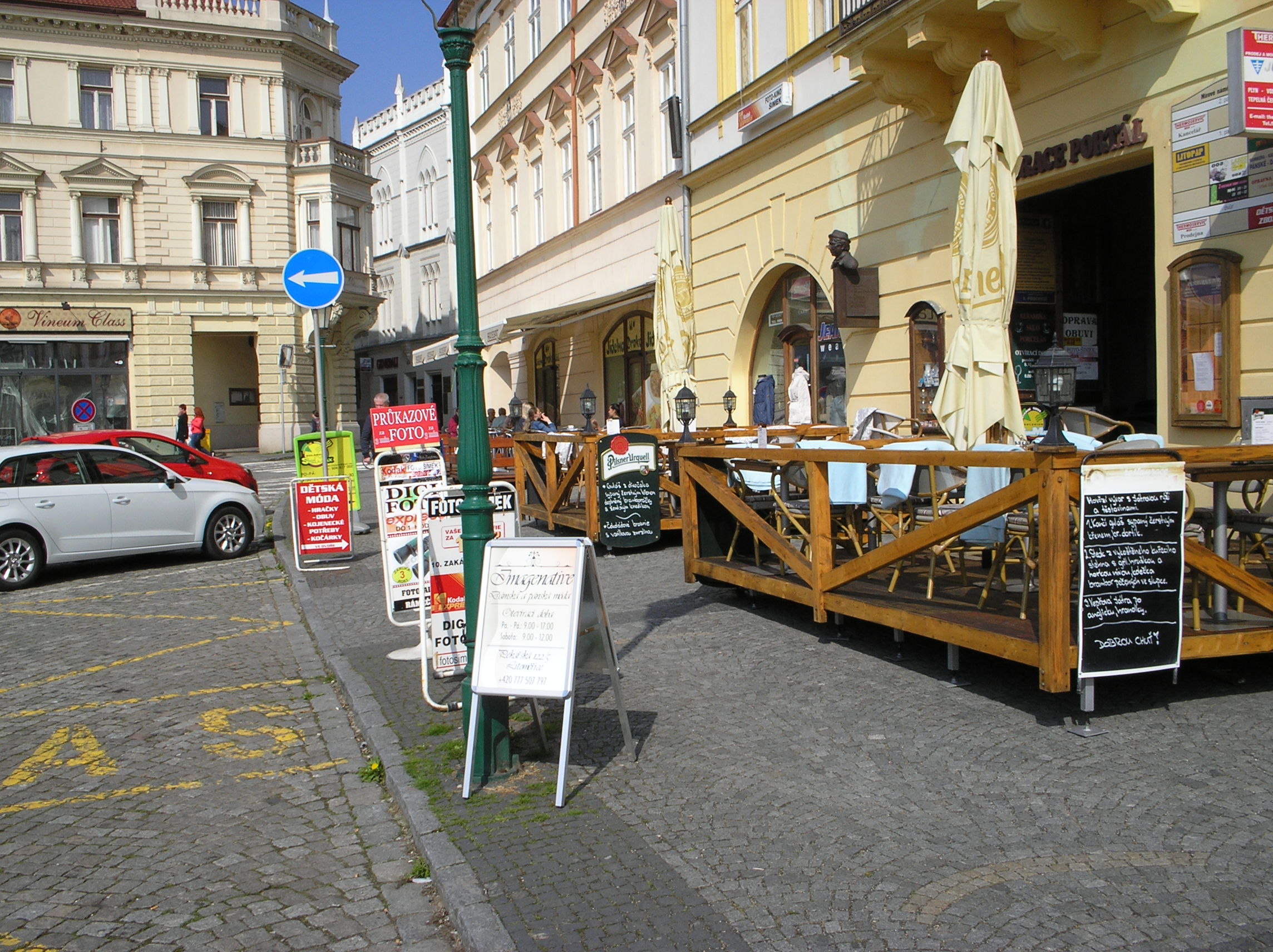 Vřelé díky pracovníkům MÚ, že nám opět po roce nechali dostatek místa pro korsování před tímto objektem. Rovněž je jistě chvályhodné, že tu povolili dostatek reklamních stojanů / z toho p.Šimek 2 ks /, které mohou případné pasanty ochránit před neplánovaným vyvrávoráním do vozovky. Když však vidím ten stojan s přidanou tabulkou na -Průkazová fota-, tak se obávám, že při případném střetu s touto "nadstavbou" by byla práce i pro "retušéry" na /plastické/ chirurgii.