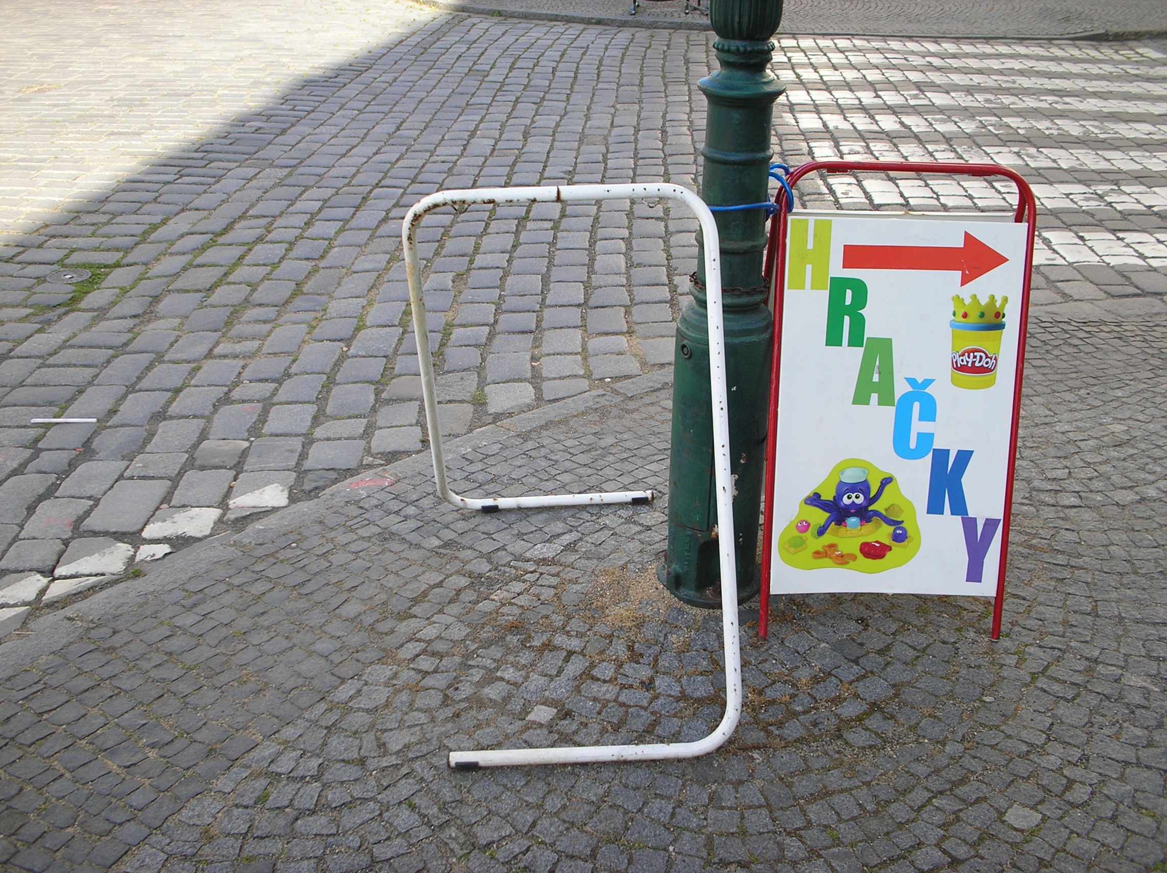 Zase jeden z výtvorů, který doporučila odborná subkomise, aby obohatila naše malebné město. Toto mobilní víko od rakve však sotva uspěje v soutěži s takovým designovým skvostem jakým jsou známé " Andělské dveře " na protější straně náměstí. A ještě dovětek: Kdy už konečně radnice zorganizuje závod o -Pohár starosty- v jízdě trakařů /zde 2ks k dispozici/ kolem reklamních stojanů námi tolik opečovávané MPR ?