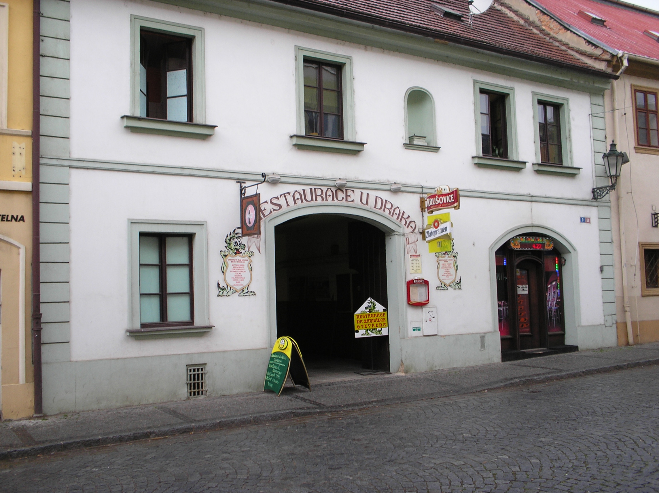 Když někdo nepozná rozdíl mezi středověkou hradební zdí a jinou zdí, tak s prominutím, má v sobě opravdovou zeď! Nikdy jsem nepsal o vyloučení reklamy z městského prostoru, ale o regulaci odpovídající podmínkám téhož.Tzn., že zvláště v historickém prostředí vadí její "řvavost", velikost formátu a množství. Jestliže je zmíněné vyloučení takovéto reklamy pro podnikatele likvidační,o čemž pochybuji, tak obdobně je likvidační pro zachovalý historicky vzniklý i současný veřejný prostor dosavadní stav. A opět příklad: - Kdysi prý tento dům chránila a zdobila v malé nice na fasádě socha sv. Jiří - Drakobijce. /Možná je v depozitáři měst.muzea./ Přemožený drak zde dle jednoho z výkladů ztělesňoval zlo. Dnes však to zlo v podobě téměř panoptikálních reklamních "artefaktů" naprosto vítězí! - Svatý Jiří, oroduj za nás! -