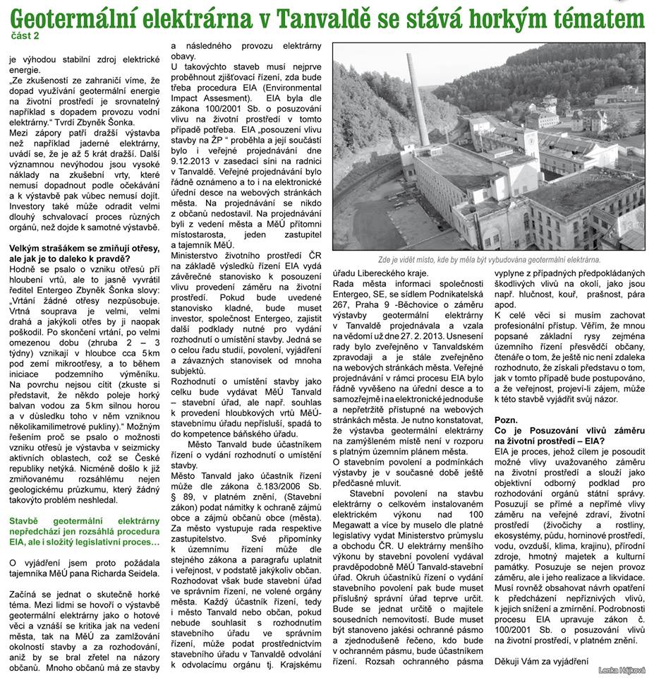 Vladislav Liška píše:Podle tohoto: http://radnice.litomerice.cz/dokument-828257.html dokumentu se zastavuje rizeni o uzemnim rozhodnuti o geotermalni elektrarne. Znamena to, ze geotermal nebude, nebo se musi pripravit jine podklady? Pripadne se to zatrhlo proto, ze jina energeticka spolecnost nesouhlasila se stavbou jak vyplyva z dokumentu? Uz se do toho vlozilo jak hodne penez tak hodne prace, tak je asi skoda to zarazit ne? Pokud nekdo vi vice, napiste prosim, diky