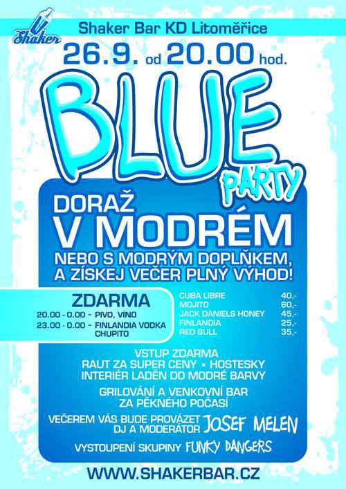 rád bych Vás pozval na BLUE PARTY, která se bude konat v pátek 26.září 2014. Tak nezapomeňte přijít v modrém.